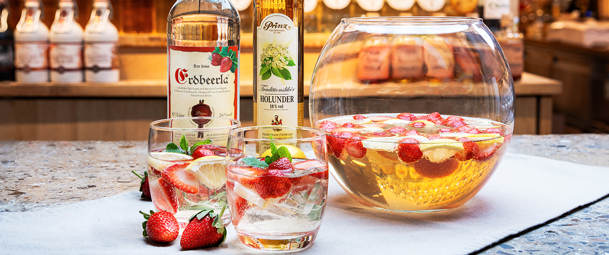 Laat verse aardbeien enkele uren trekken in 80 ml aardbeien schnaps, zodat ze hun volle smaak kunnen ontwikkelen. Doe ze vervolgens samen met ijsblokjes in een punchkom. Voeg 150 ml vlierbloesem likeur, witte wijn en prosecco toe en vul aan met bruisend mineraalwater voor een sprankelend effect.