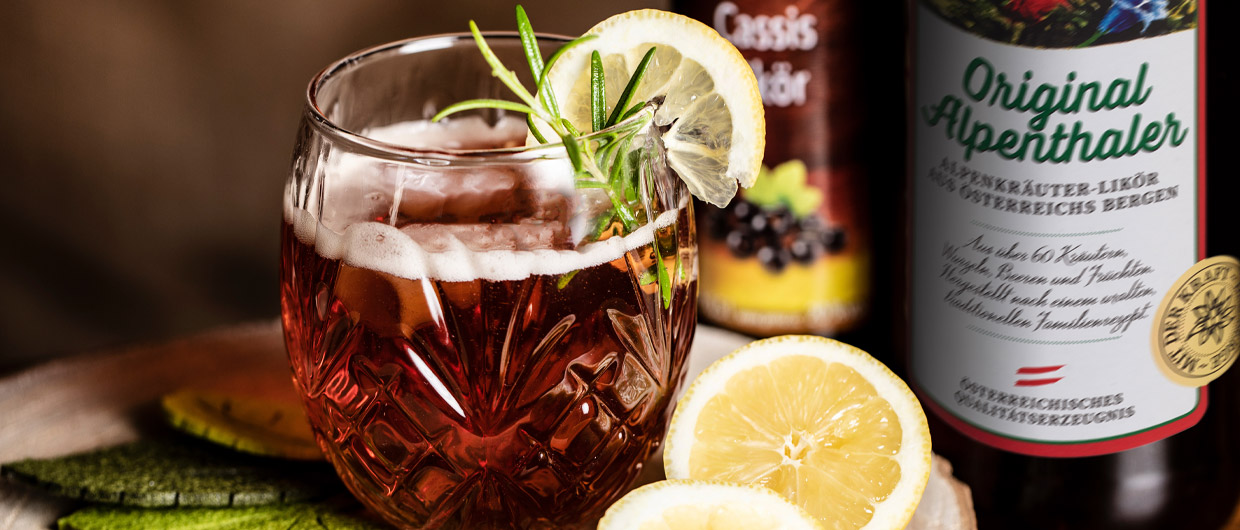 Put the Alpenthaler, lemon juice and Cassis Liqueur in a shaker. Shake well.